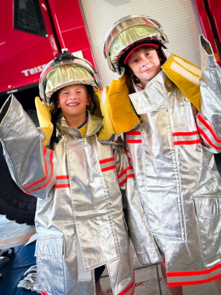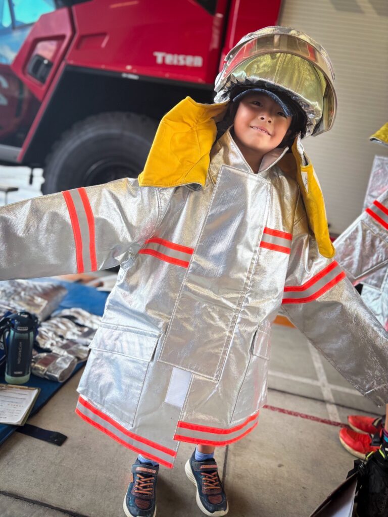 まず体験したのは 消防隊・装備体験。隊員さんから車両や道具の説明を受けたあと、防火服の試着にも挑戦しました。大きな服に包まれた子どもたちはまるで本物の消防士!「かっこいい~!」と声があがり、安全を守る仕事の大切さを肌で感じていました。