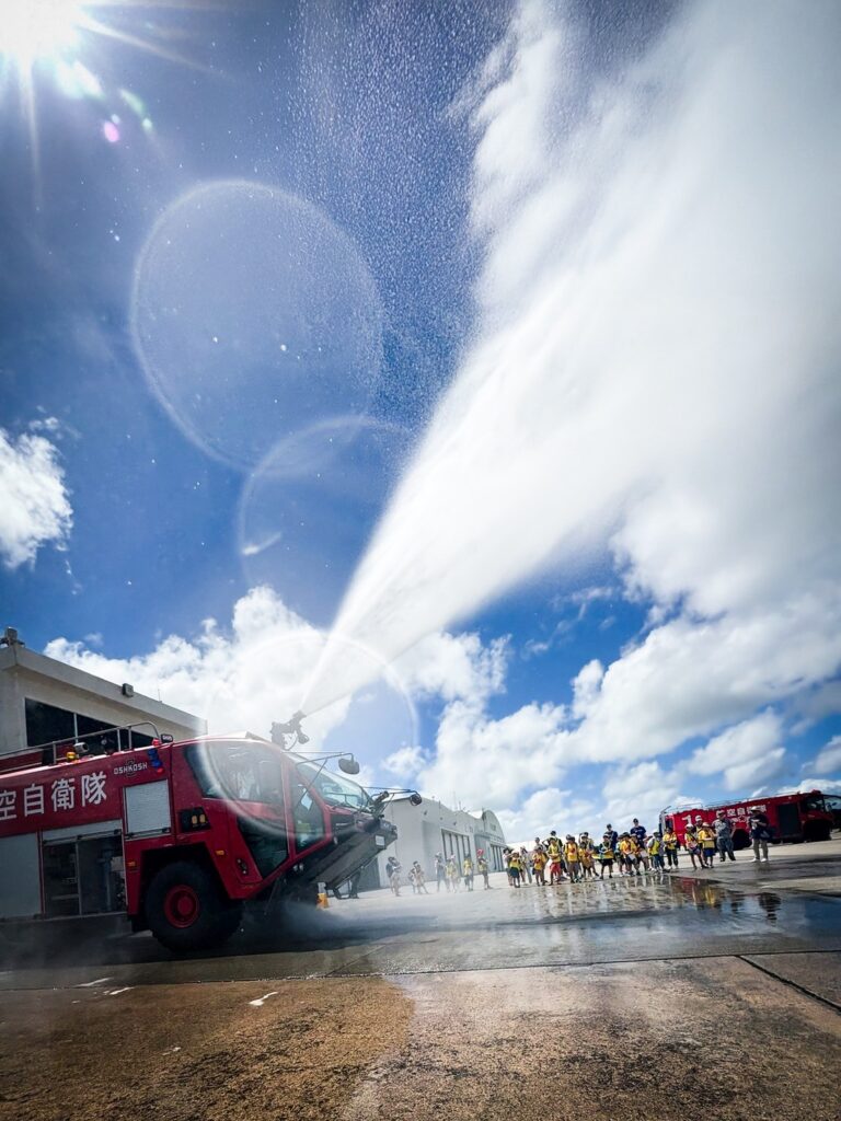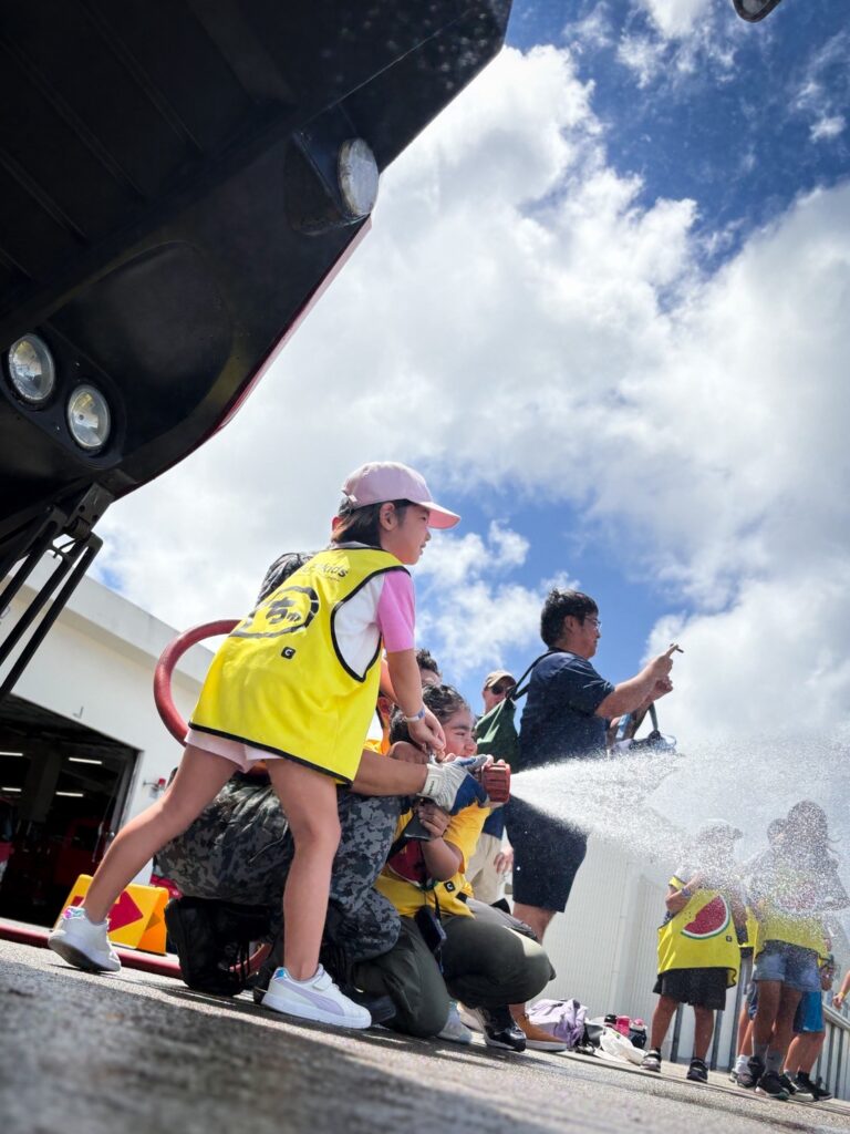 続いては 破壊機救難消防車Ⅰ-B型(オシュコシュ・ストライカー3000) を使った放水体験!轟音とともに勢いよく噴き出す水に、子どもたちは「すごーい!」と大興奮でした。普段できないスケールの大きな体験に、笑顔があふれていました。