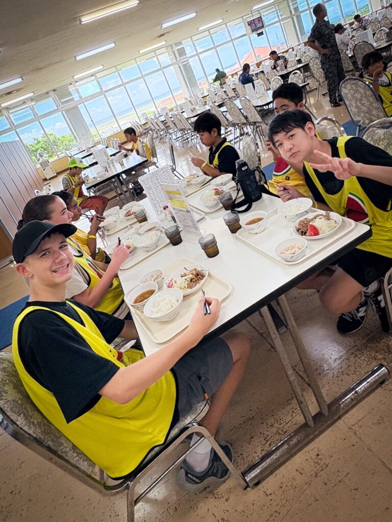 戦闘機見学の後、隊員さんたちも利用している 食堂でランチタイム をとりました。広々とした食堂で食べるごはんは格別!子どもたちも「おいしい!」と笑顔いっぱい。普段はなかなか入れない場所での食事は、特別な思い出になりました。