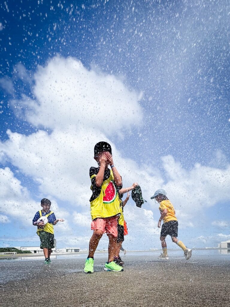 放水の迫力を体験した後は、子どもたち同士で水のかけ合いがスタート! 笑い声と歓声が飛び交い、あっという間にみんなずぶ濡れになりました。 「冷たくて気持ちいい!」と大盛り上がりで、夏らしい思い出がひとつ増えました。